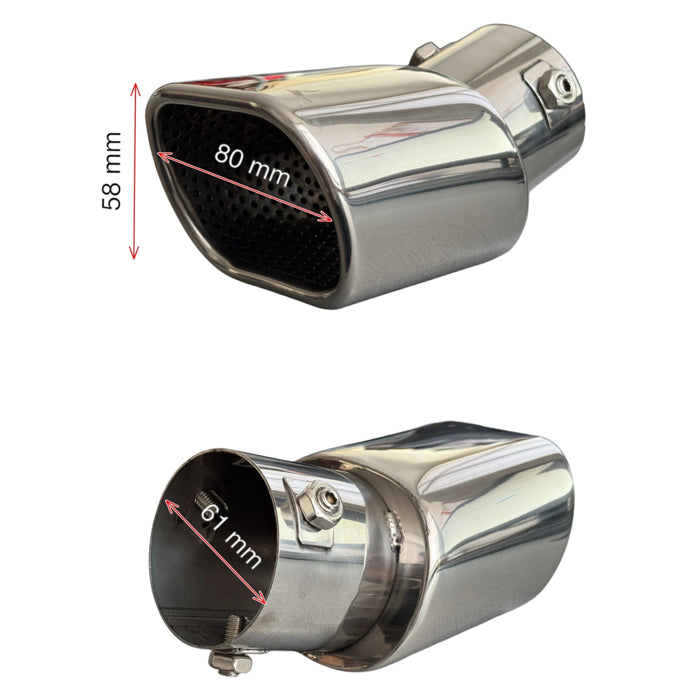 Накрайникът е изработен от никелиран метал.Начин на монтиране: СкобиВизия: Единичен.След монтажа накрайникът ще придаде спортен вид на автомобила.