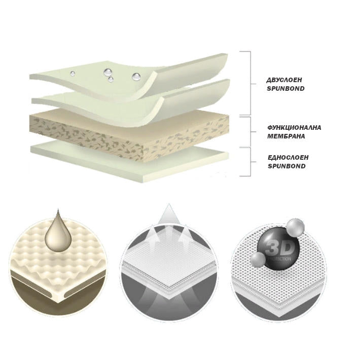 Материалът отстрани е изработен от SPUNBOND нетъкан текстил, който е труден за вода и силно паропропусклив