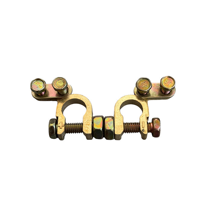 Комплект месингови клеми за автомобилен акумулатор с означение: "+" и "-".